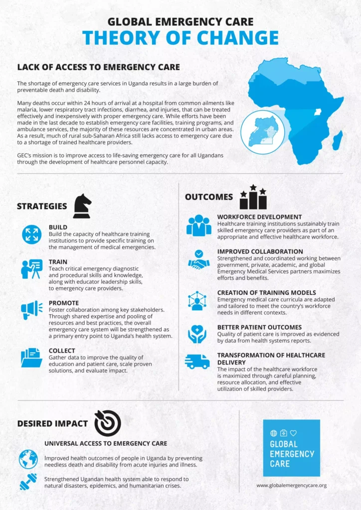 The shortage of emergency care services in Uganda results in a large burden of preventable death and disability. Many deaths occur within 24 hours of arrival at a hospital from common ailments like malaria, lower respiratory tract infections, diarrhea, and injuries, that can be treated effectively and inexpensively with proper emergency care. While efforts have been made in the last decade to establish emergency care facilities, training programs, and ambulance services, the majority of these resources are concentrated in urban areas. As a result, much of rural sub-Saharan Africa still lacks access to emergency care due to a shortage of trained healthcare providers. GEC’s mission is to improve access to life-saving emergency care for all Ugandans through the development of healthcare personnel capacity.